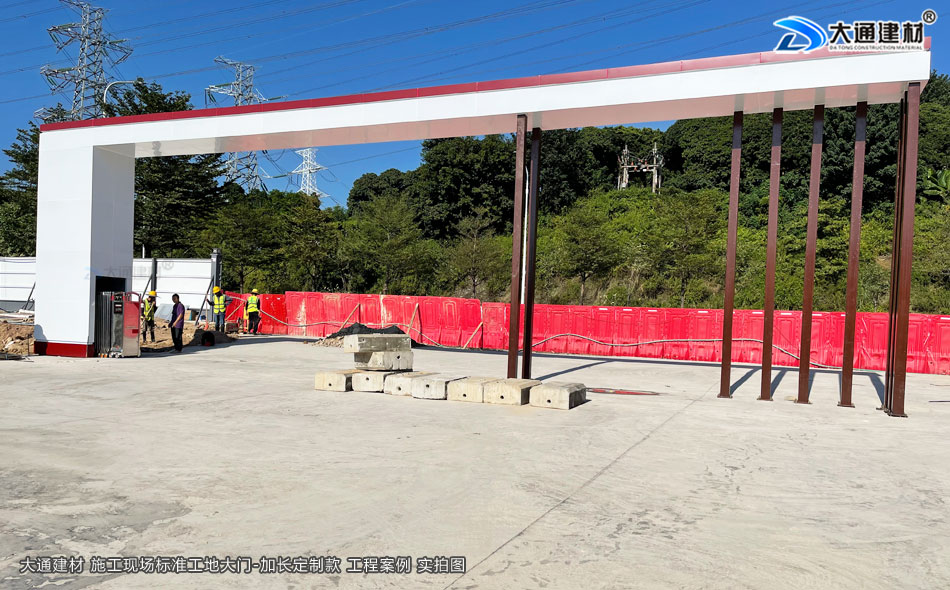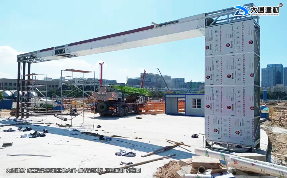 深圳市大通建材有限公司提供標準工地大門生產定制/配送安裝等服務,標準工地大門常規尺寸為14800mm*5600MM,一些項目工程有特殊需求的可以根據實際需求進行定制化生產,如下面展示的這款鋼結構標準工地大門定制加長款的尺寸是16800mm*5600MM,其它尺寸工地大門有需求的亦可定制化生產。
