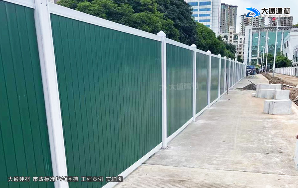 深圳大通建材生產批發的符合惠州市政標準的綠色PVC圍擋,表面經烤漆工藝噴涂、鮮艷的綠色、表面光滑,具有美觀環保,快速拆裝,簡單快捷,安全牢固,經濟實用、成本低等特點,非常適用于市政道路施工隔離防護使用。