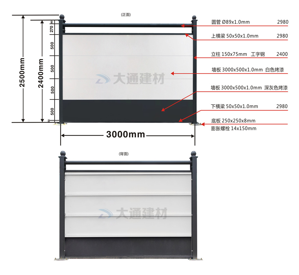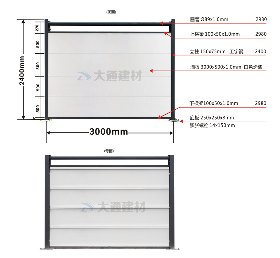 大通建材C類裝配式鋼結(jié)構(gòu)圍擋烤漆款這兩款的烤漆鋼板厚度都是1.0mm,都是采用工字鋼立柱,同時每一擋圍擋的長度都是3米,但不同款式的圍擋高度卻有些不一樣喔,而C類圍擋常用款的圍擋高度通常是2.5m/2.4m,具體請參照上述展示的圍擋參數(shù)圖。