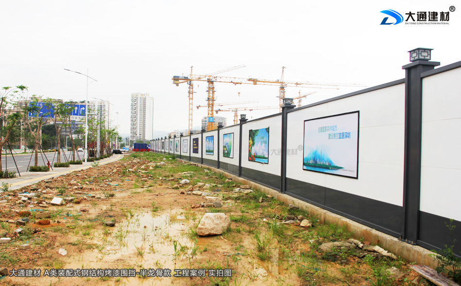 深圳市大通建材鋼結構圍擋A,堅持深圳質量,關注城市美學,培育精益求精的工匠精神,結合深圳開放、創新、現代、濱海的城市的特征和公益宣傳的要求,提供具備不同區域環境特點的外觀設計方案,外觀顏色可以是白色+深灰色烤漆擋板、亦可是全白色烤漆擋板、美觀大氣的現代風格; 再結合城市區域特點,分片區、分道路、分街景各自選用同類風格圍擋,營造美觀、整潔的城市環境的同時實現圍擋風格區域性的協調統一。