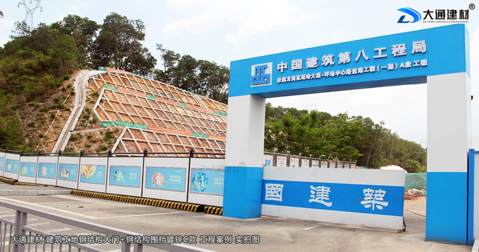 中國建筑八局集團在深圳市龍崗區蛇嶺大道坪地中心路道路工程(一期)A段的工程項目,選用了深圳市大通建材生產的鋼結構工地大門為項目部大門。