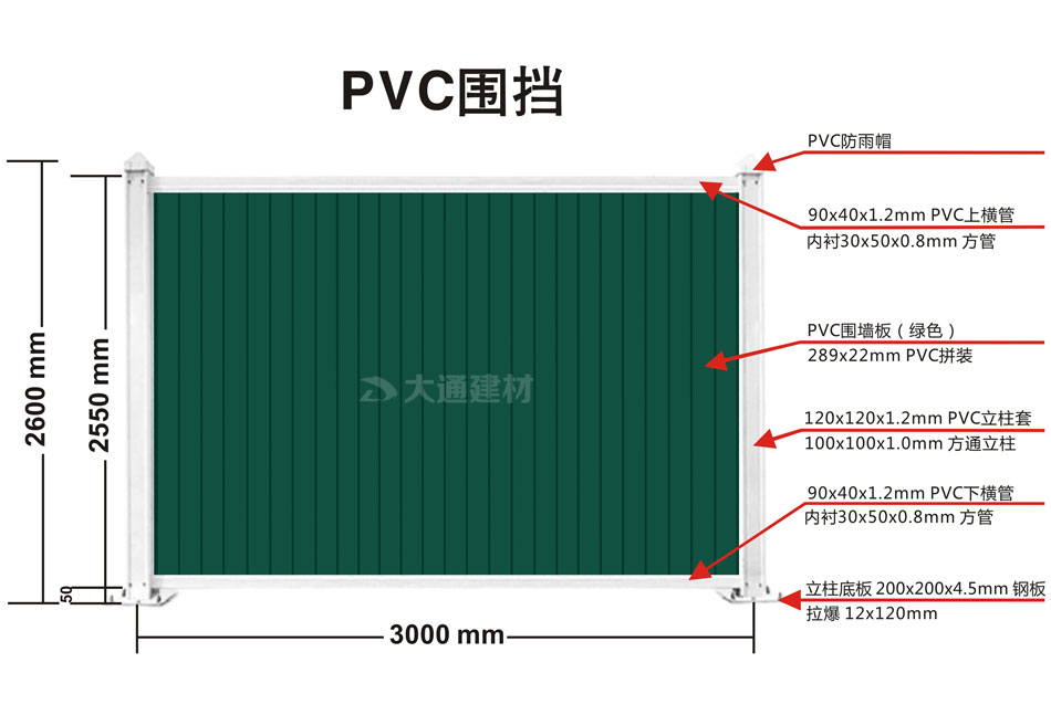 大通不同顏色的PVC圍擋之間最大區別是PVC圍墻板的顏色不一樣,相同地方是:PVC圍擋的圍墻板都是PVC長條版拼接,立柱、橫管均為白色PVC材料,內部均襯塑鋼方通,立柱底板為鋼板,并加斜支撐,增加受力,確保更安全穩固。