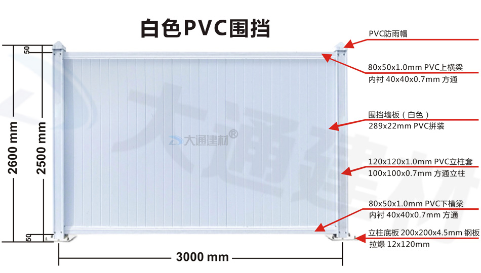 深圳市大通建材生產批發PVC圍擋符合市政標準,這款圍擋的圍墻板面采用PVC長條版拼接,立柱、橫管均為PVC材料,內部均襯方通。立柱底板為鋼板,并加斜撐受力。大通建材常規款PVC圍擋尺寸長3mx高2.5m、長3mx高2.2m、長3mx高2.0m 其它PVC圍擋尺寸可按實際需要進行定制生產。
